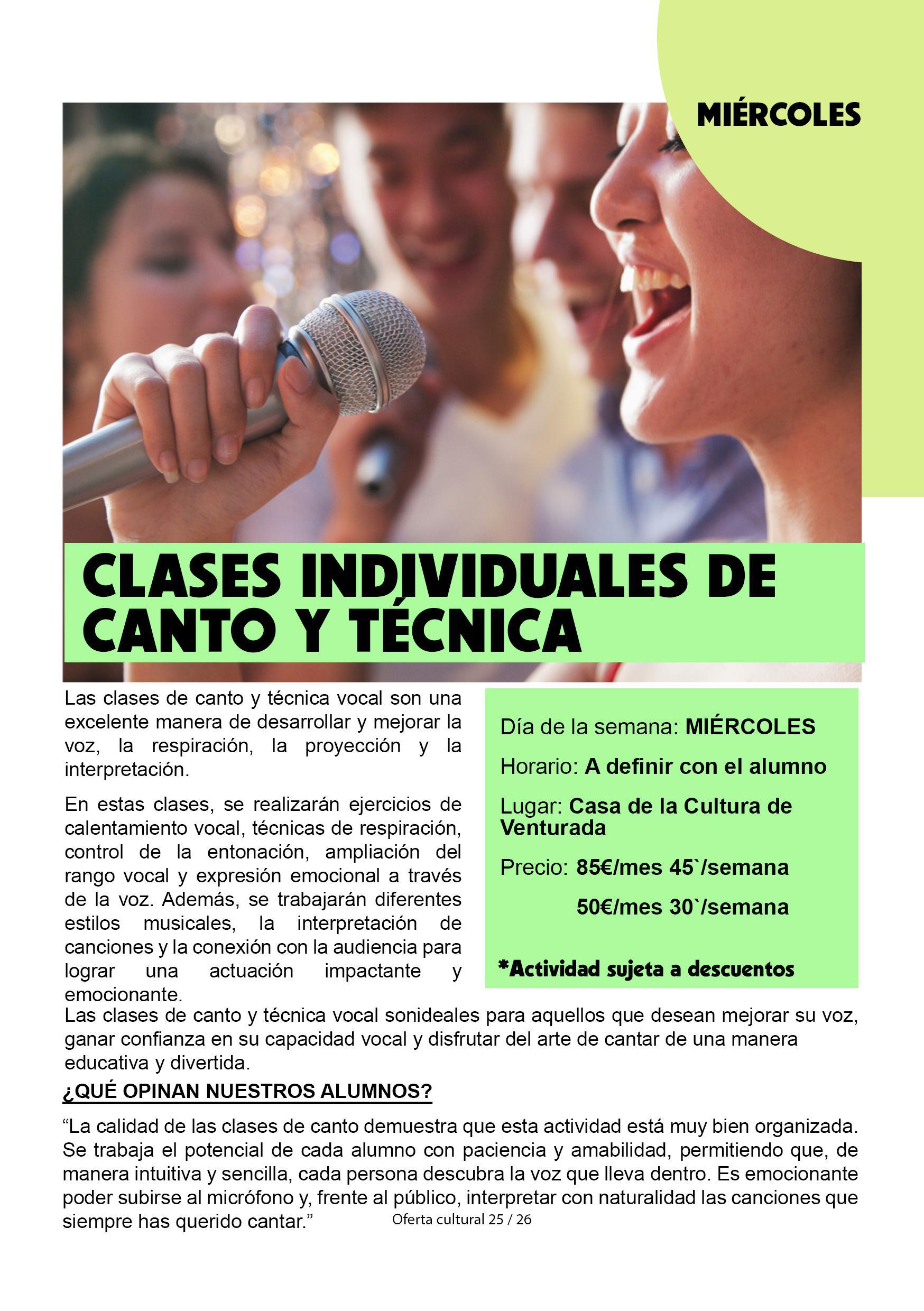 Clases individuales canto y técnica Casa de la Cultura de venturada Itinerario Email Llamar + Info Incripciones: https://actividades.venturada.org/ Itinerario Email Llamar + Info