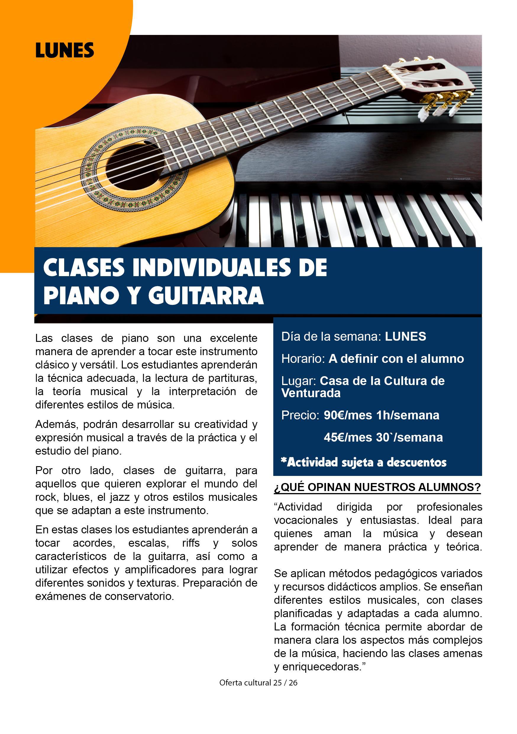 Clases individuales de piano y guitarra Casa de la cultura de Venturada Itinerario Email Llamar + Info Inscripciones: https://actividades.venturada.org/ Itinerario Email Llamar + Info