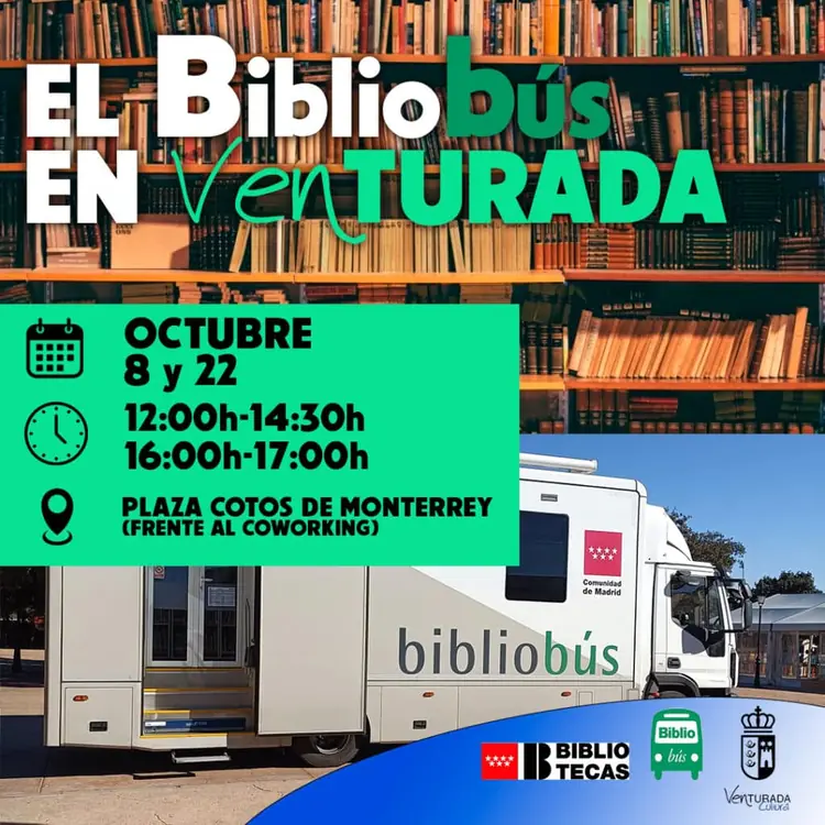 Recuerda el próximomiércoles 22 de octubre, nos visita el bibliobús, para disfrutar de la lectura y descubrir nuevos libros.Nuevo horario: 12:00h – 14:30h y 16:00h – 17:00hPlaza de Cotos de Monterrey, frente al edificio de Coworking¡Ven a explorar historias, aprender y pasar un buen rato!