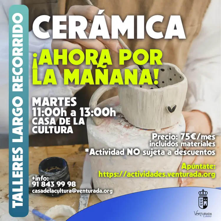 ¡Nuevo horario de cerámica!Ahora las clases son los martes de 11:00h a 13:00h en la Casa de la Cultura.En este taller aprenderás las técnicas fundamentales del modelado cerámico: amasado, modelado, esmaltado y cocción. Además, exploraremos la cerámica como un medio artístico y expresivo, conectado c