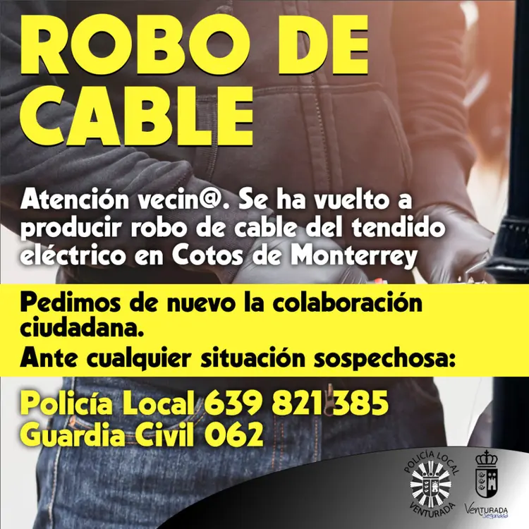 Atención vecin@ Se han vuelto a producir robos de cable del tendido eléctrico en nuestro municipio.El robo se ha situado en la zona de las C/ Pedriza , Peñalara , Siete Picos, Sierra Nevada , Guadarrama y Pirineos.Si ves “operarios sospechosos” manipulando arquetas, por favor contacta de inmediato c