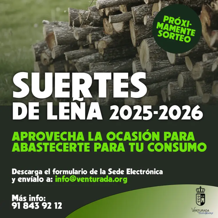 Desde el Ayuntamiento de Venturada lanzamos el Plan de Suertes de Leña 2025/2026 para promover un uso sostenible de los bosques y prevenir incendios forestales.Para mayores de 18 años, un adjudicatario por hogarCumplimiento de normas forestales y medioambientalesAprovechamiento hasta 31 de marzo de