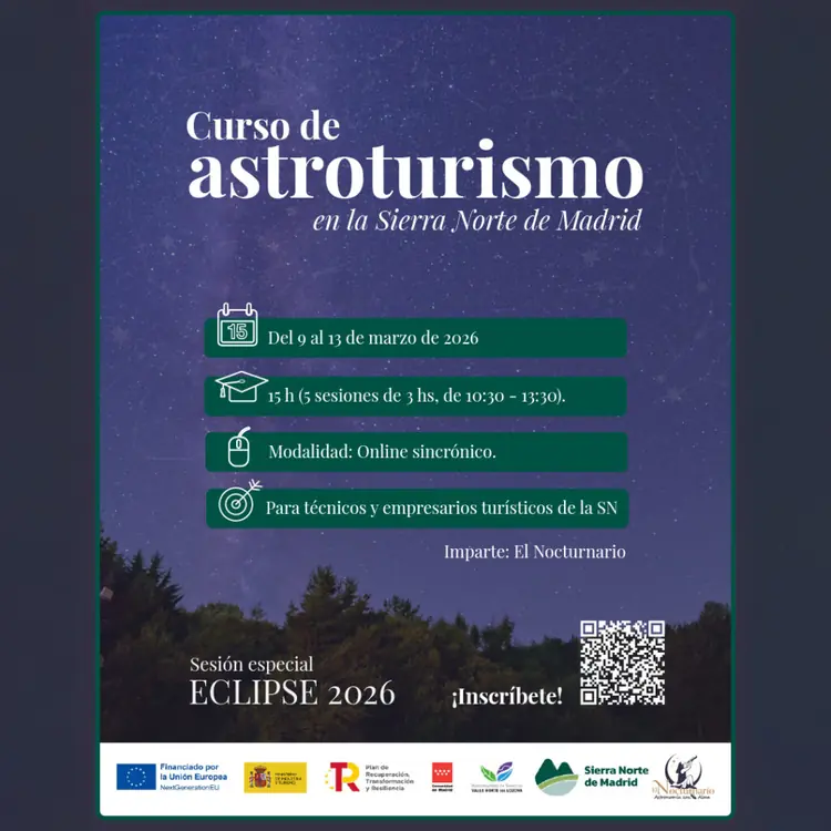 Curso Online: Astroturismo y Gestión del Eclipse 2026Fechas: 9 – 13 de marzo 2026Duración: 15 h (5 sesiones de 3 h, 10:30 – 13:30)Modalidad: online sincrónicoDirigido a: técnicos y empresarios turísticos de la Sierra NorteImparte: el Nocturnario, expertos en astroturismo y divulgación astronómica co