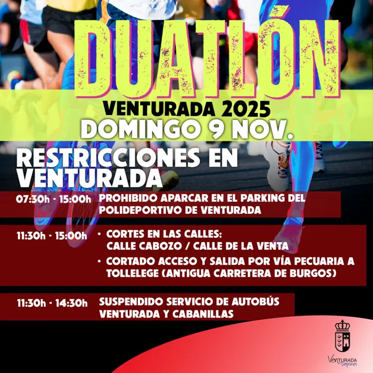 Aviso Importante – Duatlón Venturada (domingo 9 de noviembre)Con motivo de la celebración del Duatlón este domingo, se aplicarán las siguientes restricciones de tráfico y estacionamiento en el municipioRogamos a vecinos, vecinas y visitantes planificar sus desplazamientos con antelación y seguir en