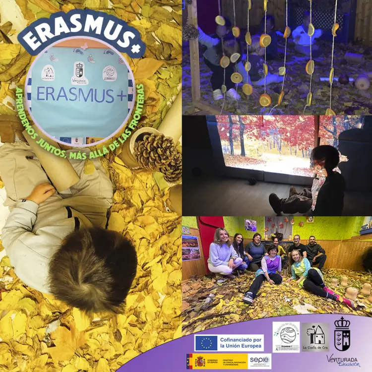 2ª actividad de la experiencia Erasmus+ “Infancia sin fronteras”Instalación de Otoño para niños y niñas de 0 a 3 años Un espacio sensorial y estéticamente cuidado donde los más pequeños pueden explorar libremente materiales naturales como hojas, piñas, ramas, frutos y telas.Esta propuesta se inspira