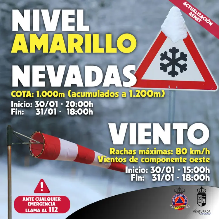 NIVEL AMARILLO POR NEVADAS Y VIENTOS EN MADRID SIERRAActualización de la meteorología para los próximos díasAnte cualquier emergencia que se produzca llama al 112.Mantente informado y ante todo precaución.La entrada Actualización meteorología se publicó primero en Ayuntamiento de Venturada.